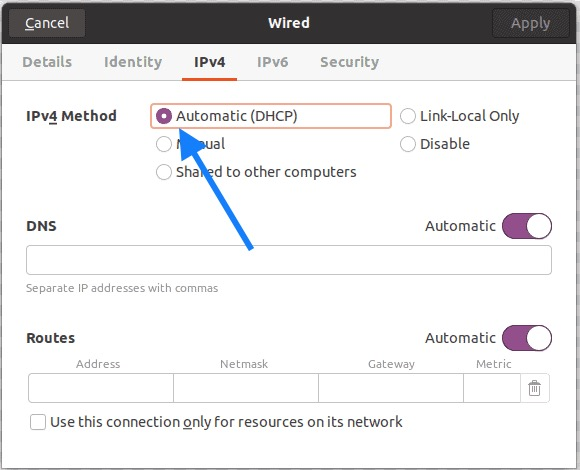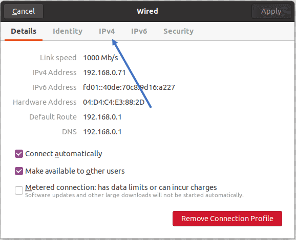 4. Under IPv4 you can see the automatic (DHCP) is selected.